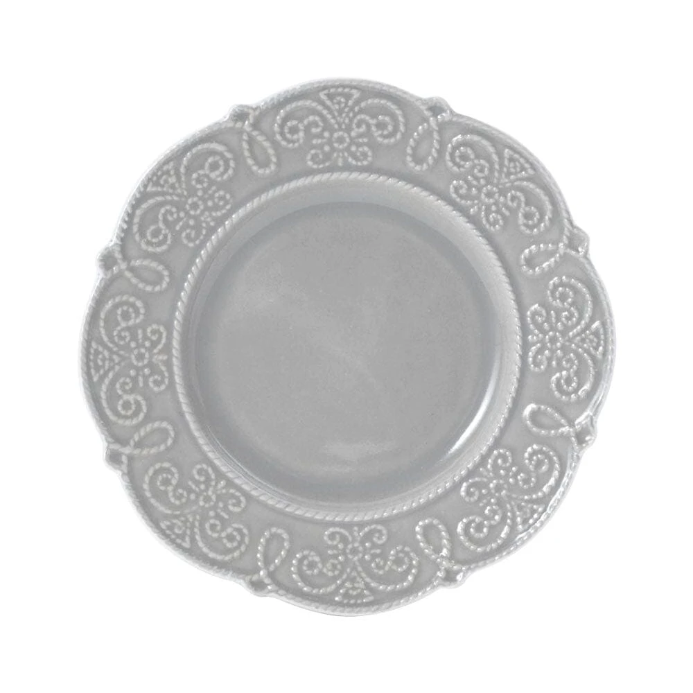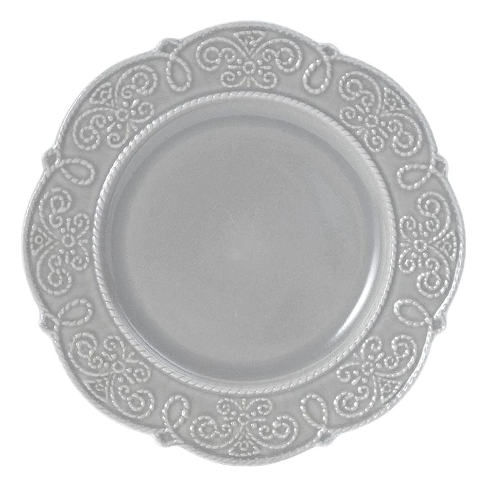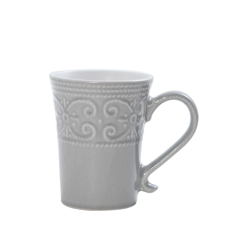 Pfaltzgraff Abby Gray collection features a scalloped edge design and a flourish of scrolls encircling each piece, bringing a traditional look to any dining occasion. Crafted of high-quality stoneware for strength and durability. 16 piece dinnerware set, service for four, includes (4) each: 10-1/2 inch dinner plate, 8-1/2 inch salad plate, 6 inch (26 ounce) cereal bowl, and 12 ounce mug. Microwave and dishwasher safe.