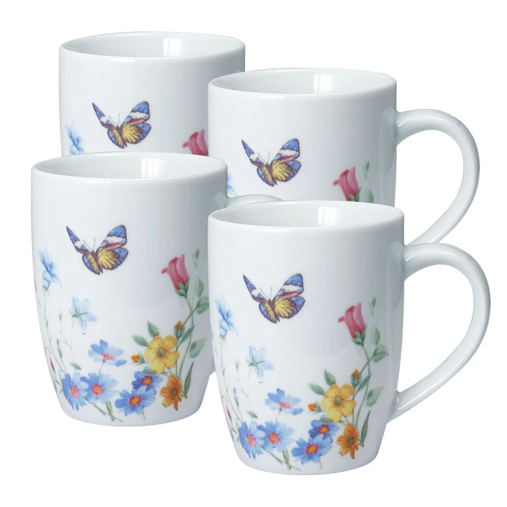 These mugs are perfect for morning coffee, afternoon tea, or cocoa by the fire, but theyre also great for juice, milk or tangy soup. Fill with flavored coffee or tea making a lovely gift for a friend or co-worker. Crafted of porcelain. Microwave and dishwasher safe. Set of 4 mugs, each holds 13 ounces.