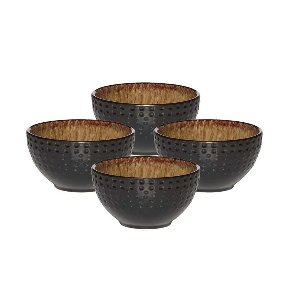 Crafted of Stoneware, featuring a reactive glaze. Due to the nature and hand-crafted qualities of reactive glaze, no two pieces are exactly alike and will exhibit unique variations in color and pattern. Product may slightly differ from image shown. Microwave and dishwasher safe. Set of 4 fruit bowls, each measure 4-1/4 inch diameter x 2-1/4 inch high and hold 10 ounces.