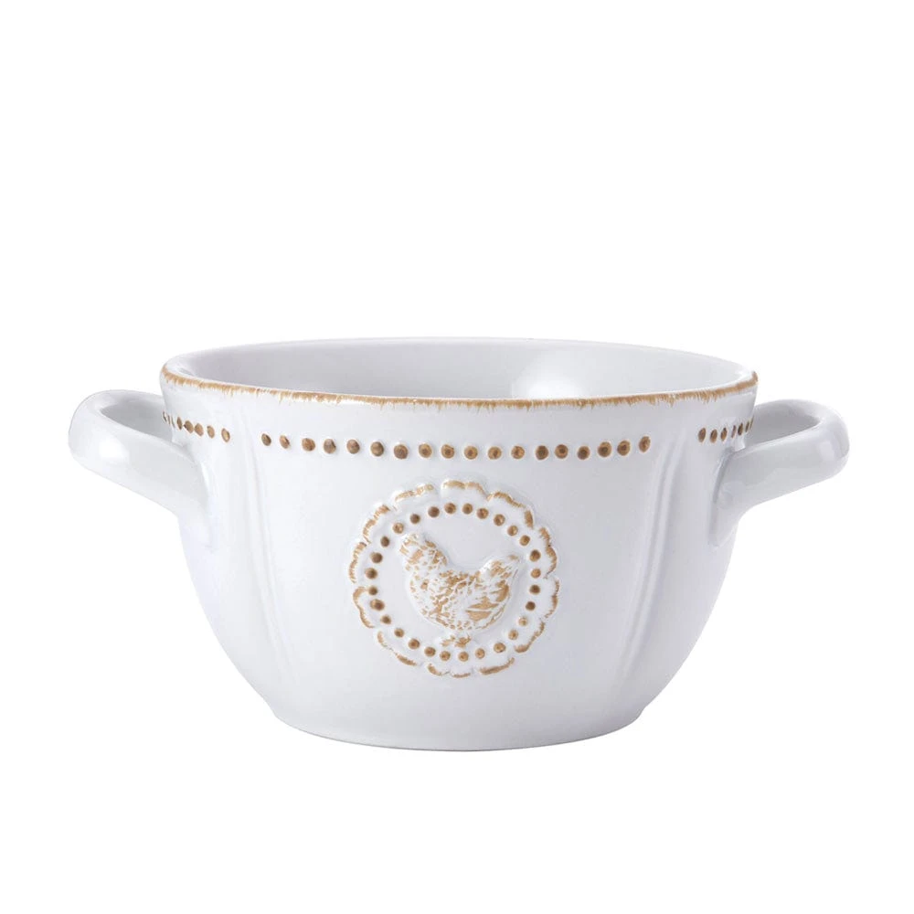 This Farmhouse Hen Double Handled Bowl features subtle scalloped edges, bordered by an eye-catching embossed dot and line pattern with an antiqued finish, and an embossed hen accent. This bowl will help you keep a firm grip on the contents, and will add rustic, country charm to your table.