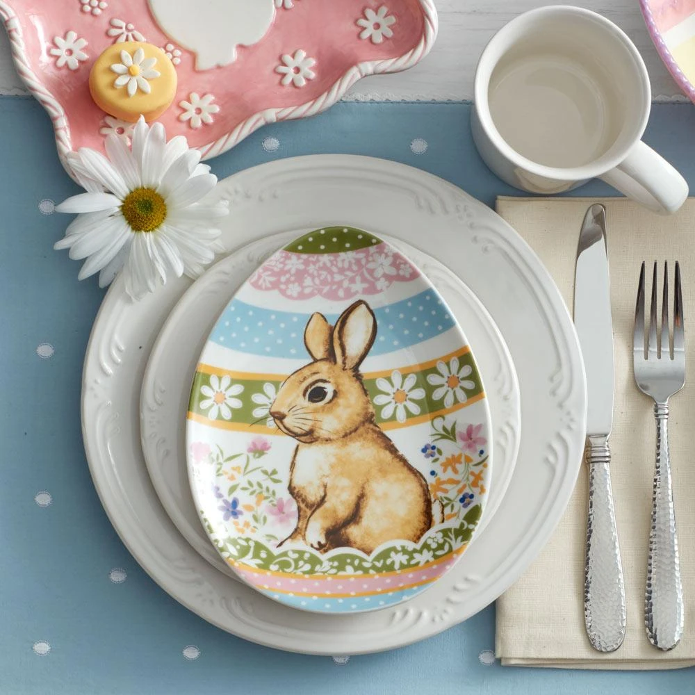 As winter turns to spring, bunnies make their appearance, and this adorable Flowers Bunny Rabbit Plate will add a seasonal touch to your home. A cute little bunny takes center stage, with Filigree flowers adding a colorful and cheerful addition to this whimsical plate. Crafted of stoneware. Microwave and dishwasher safe. Flowers bunny plate measures 8 inch long x 6-1/4 inch wide.