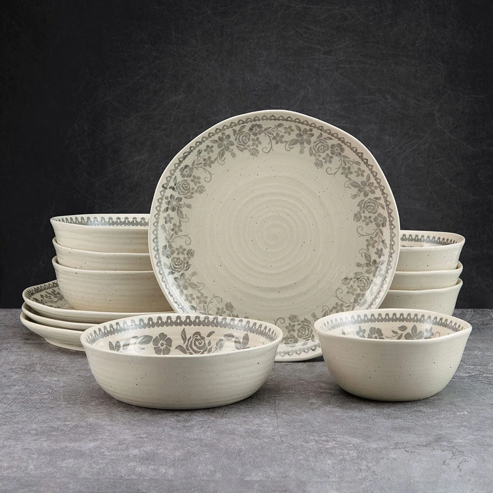 Hayden Grey dinnerware set is uniquely crafted with subtle organic shaped plates and bowls with a concentric ribbed design and a delicate floral motif. Each piece brings natural elegance to everyday dining.
