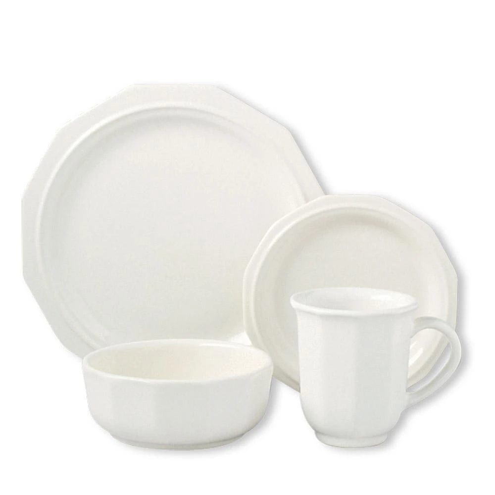 Constructed of stoneware. Each service includes: 10 inch dinner plate, 7 inch salad plate, 20 ounce soup cereal bowl and 10 ounce mug. Microwave and dishwasher safe.