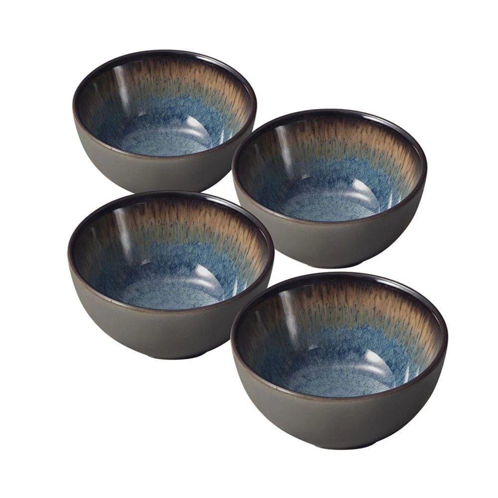 This Pfaltzgraff Monroe Blue Set of 4 Fruit Bowls features an eye-catching speckled blue effect in the center, a natural line design circling the rim, and a deep, dark band framing the edge, with a reactive glaze finish. Due to the nature and hand-crafted qualities of reactive glaze, no two pieces are exactly alike and will exhibit unique variations in color and pattern. Product may slightly differ from image shown