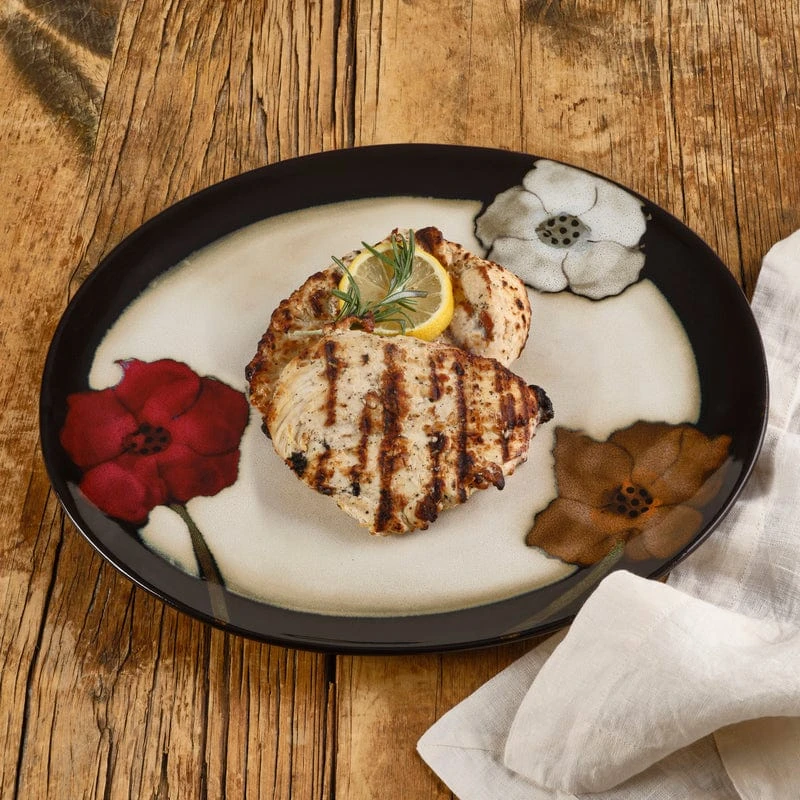 Crafted of Stoneware, featuring a reactive glaze. Due to the nature and hand-crafted qualities of reactive glaze, no two pieces are exactly alike and will exhibit unique variations in color and pattern. Product may slightly differ from image shown. From family breakfasts with stacks of pancakes to pot roast with vegetables at dinner, this generously sized platter will handle it all. Microwave and dishwasher safe. Oval platter measures 14 inch long x 11-1/2 inch wide.