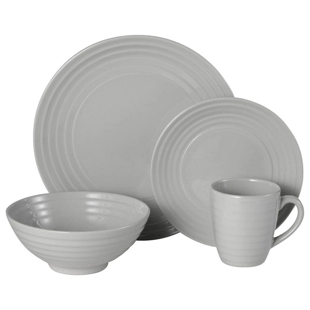 Crafted of stoneware. 16 piece dinnerware set, service for four, includes (4) each: 11 inch dinner plate, 8 inch salad plate, 7 inch diameter (30 ounce) soup cereal bowl and 12-1/2 ounce mug. Microwave and dishwasher safe.