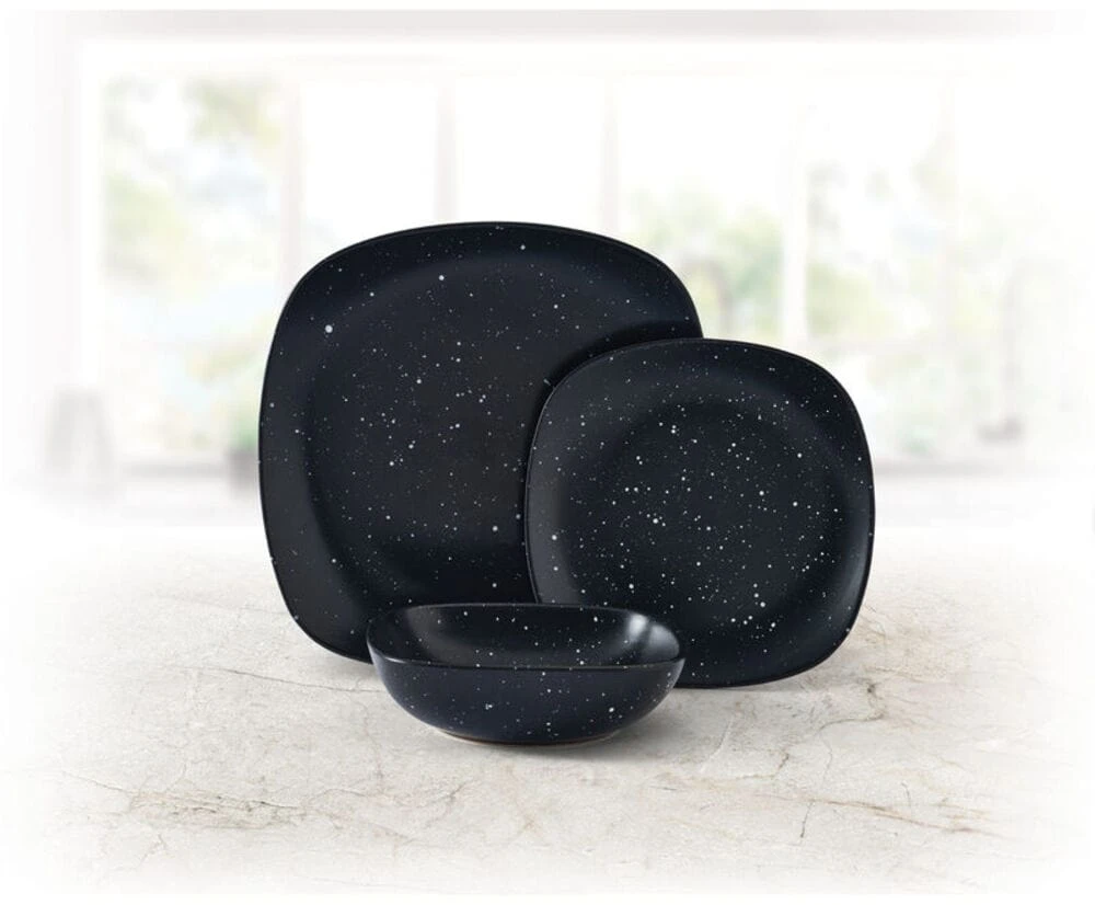Make every meal a trip to the stars with this Stella 12 Piece Square Dinnerware Set. Contemporary, square-shaped pieces with gently curved corners in bold black have a full-coverage speckled glaze finish that creates a galactic landscape across the surface of your tabletop.