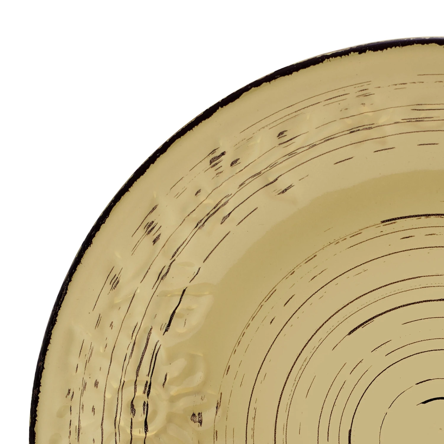 This Trellis Sunflower Dinnerware Set features a bold yellow background glaze with dark striations swirling around each piece, giving it a weathered, rustic look, and the rim is adorned with a subtle, embossed funflower design, making this a perfect set for everyday dining.