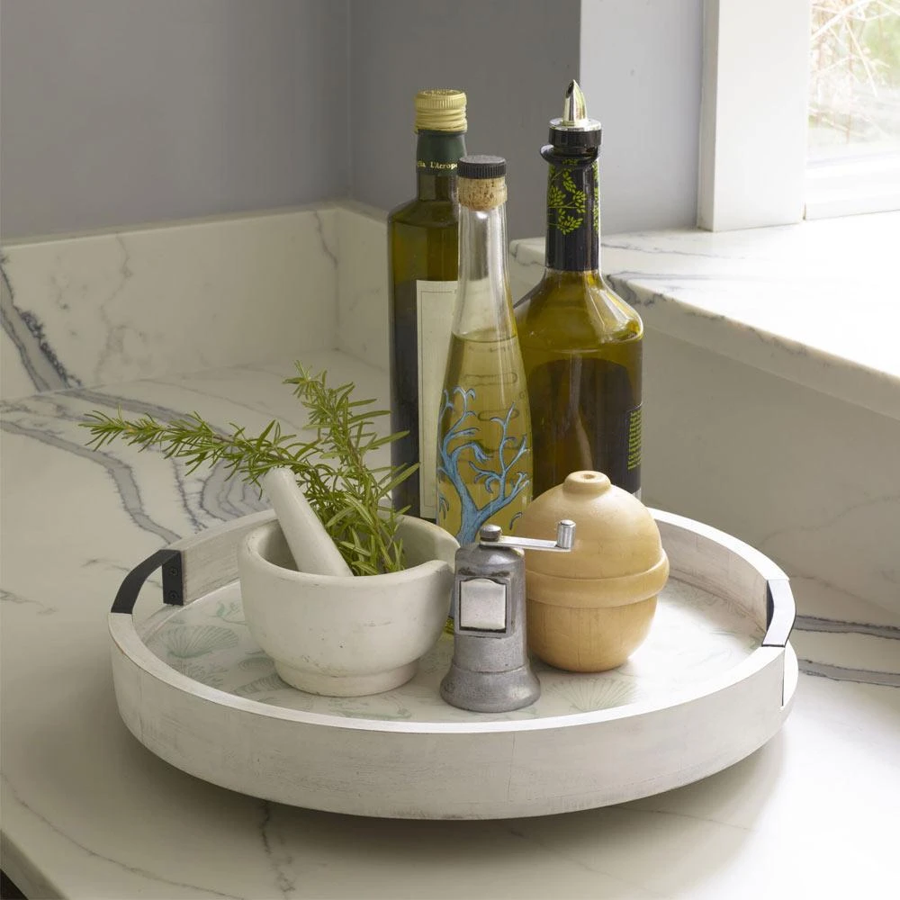 • Crafted of mango wood with a weathered whitewash finish, iron handles and a whimsical aquatic pattern on the inner surface
