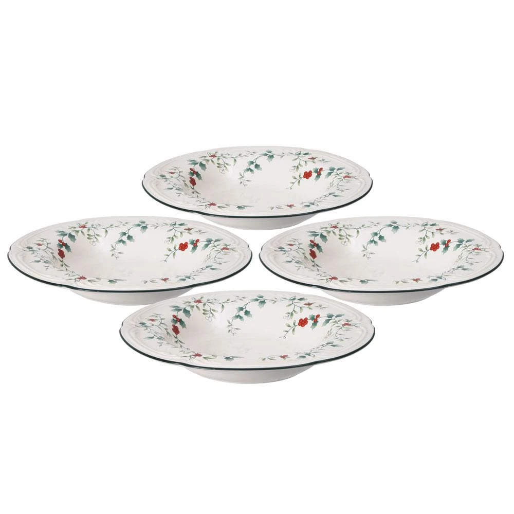 The wide rim on these generous bowls was designed for balancing a piece of bread or crackers to accompany a hearty soup. Constructed of stoneware. Microwave and dishwasher safe. Set of 4 rim soup bowls, each measures 9 inches in diameter and holds 8 ounces.